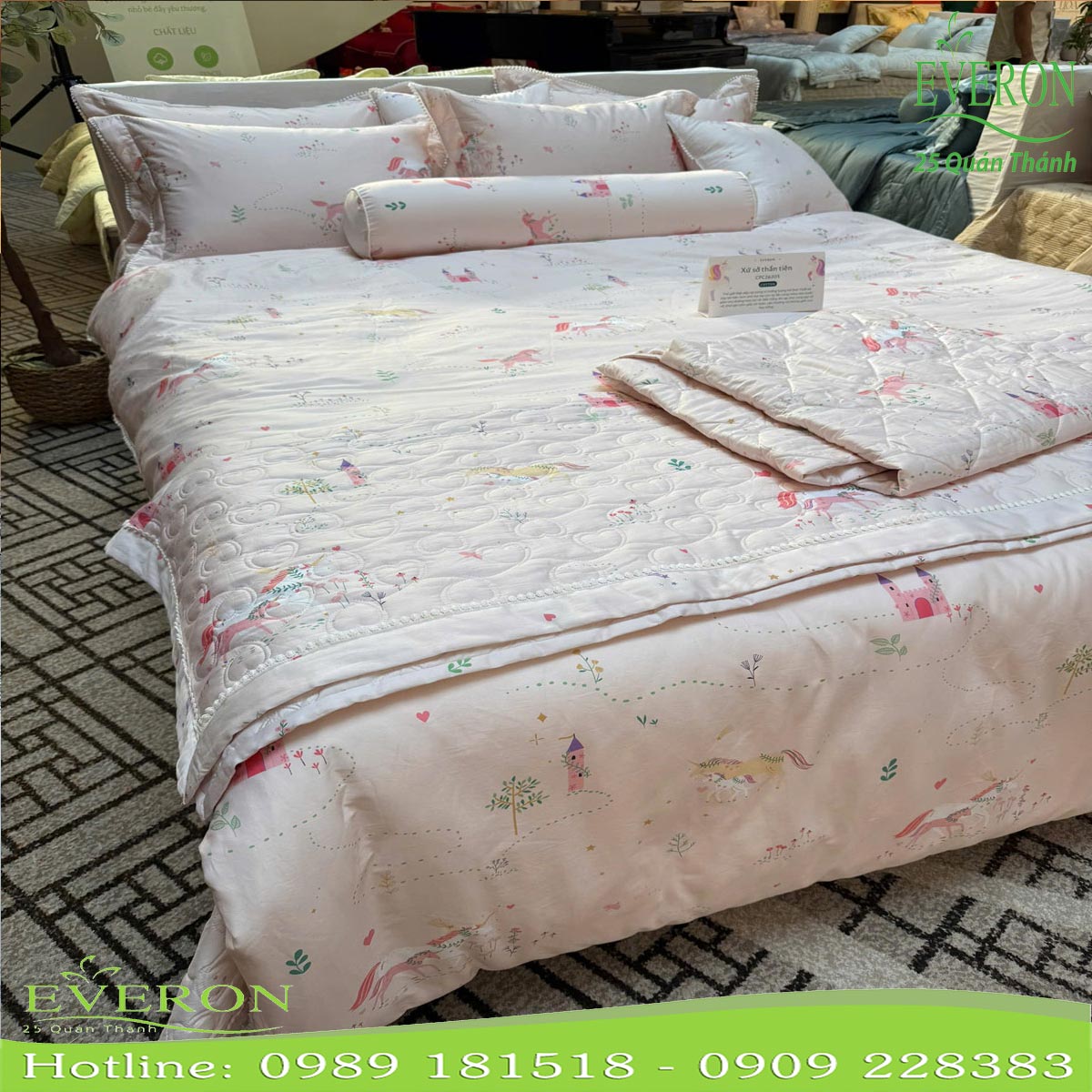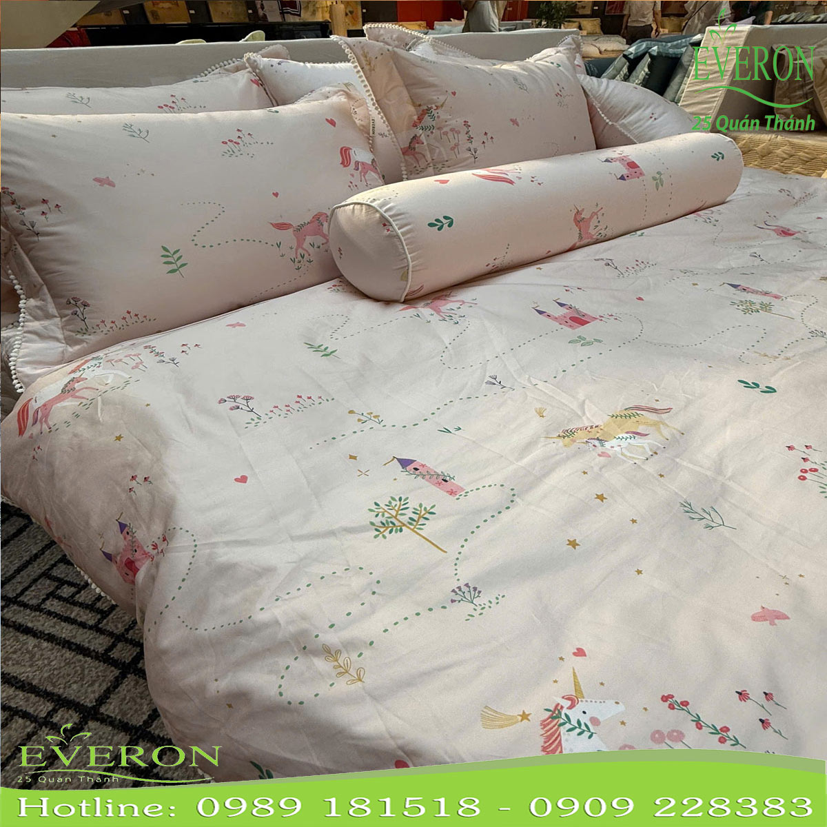 Những chú ngựa, lâu đài được cách điệu trên nền hồng giúp bộ chăn ga rất dịu dàng và vô cùng đáng yêu dành cho các bé gái